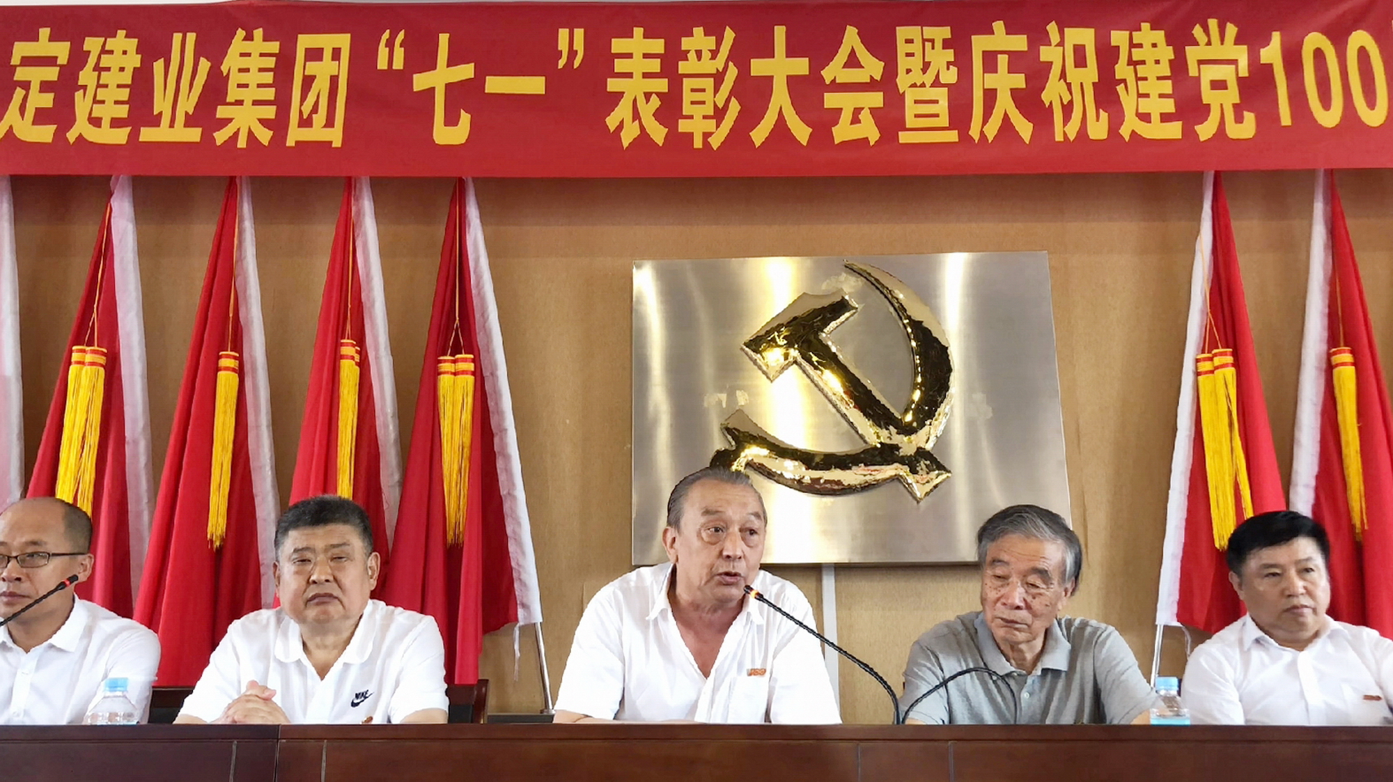 集团党委副书记马亚军致开幕词:今天是一个伟大的日子,是我们伟大的中国共产党100岁华诞,我们在这里隆重集会,召开庆“七一”表彰大会暨庆祝建党100周年演讲比赛,旨在弘扬正气,创先争优,充分发扬党员的先锋模范带头作用和党支部的战斗堡垒作用;通过举办演讲比赛,旨在激发建业人爱国之心、厚植建业人家国情怀、淬炼建业人强国之志、激励建业人勇于创新。希望广大党员干部,要以先进为榜样,坚定理想信念,坚守政治立场,认真学习习近平新时代中国特色社会主义思想,牢记四个意识、坚定四个自信,坚持四个服从,做到两个维护,不忘初心和使命,做到在企忧企,为企尽职,为企尽责,在各自岗位上全力开创新局面,不断取得新成绩,以更加优异成绩为建党百年献礼。